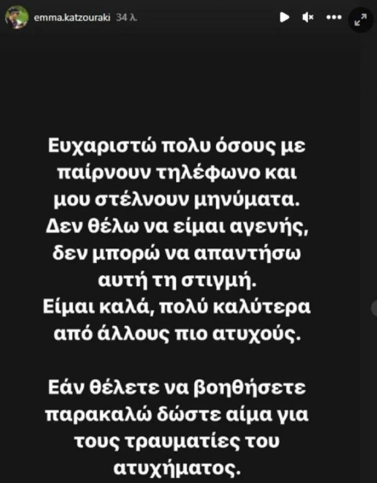 «Ευχαριστώ πολύ όσους με παίρνουν τηλέφωνο και μου στέλνουν μηνύματα. Δεν θέλω να είμαι αγενής, δεν μπορώ να απαντήσω αυτή τη στιγμή. Είμαι καλά, πολύ καλύτερα από άλλους πιο άτυχους. Εάν θέλετε να βοηθήσετε, παρακαλώ δώστε αίμα για τους τραυματίες του ατυχήματος» είχε γράψει.
