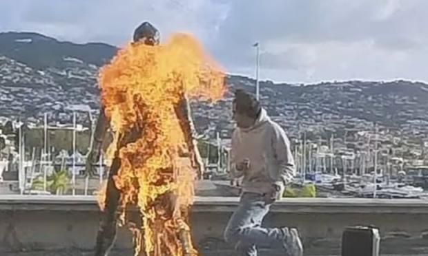 Οι φλόγες τύλιξαν για λίγα δευτερόλεπτα το άγαλμα, προτού σβήσουν, ενώ ο ίδιος απομακρύνθηκε χορεύοντας προκλητικά υπό τους ήχους ραπ μουσικής που έπαιζε από φορητό ηχείο.