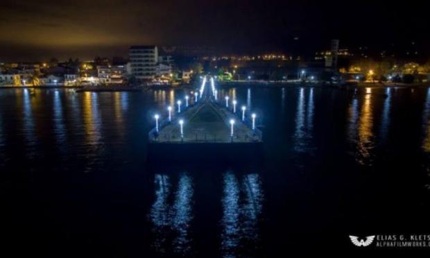 Τα χιλιάδες λαμπιόνια στις κολόνες κατά μήκος της γέφυρας, που μέσα στη νύχτα φαίνεται να προχωρούν μέσα στη θάλασσα, κάνουν το τοπίο μαγευτικό και άκρως Χριστουγεννιάτικο.