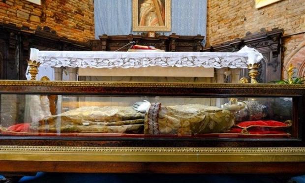 Η Αγία Ελένη είναι η πρώτη χριστιανή Αυτοκράτειρα. Η μία λειψανοθήκη είναι ανθρωπόμορφη αργυρή κεφαλή με στέμμα, η οποία παρουσιάζει το πρόσωπο κεκοιμημένης γυναικός και εμπεριέχει εντός αυτής τμήμα της κάρας. Η δεύτερη μεταλλική λειψανοθήκη έχει σχήμα ανθρώπινου σωματότυπου που εμπεριέχει στο εσωτερικό λείψανα της Αγίας αριθμημένα και σφραγισμένα. Επειδή η παράδοση των Δυτικών είναι να εμφανίζουν τα ιερά λείψανα ενδεδυμένα, γι' αυτόν τον λόγο η Αποστολική Διακονία προσέφερε προς τιμήν της ένα επιβλητικό πορφυρό βυζαντινό ένδυμα. Σημειώνεται ότι το αρχικό ένδυμα της Αγίας Ελένης είναι στα χρώματα της ώχρας και είναι βενετσιάνικο.