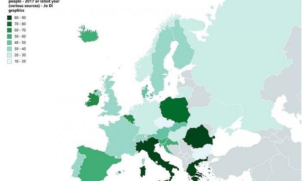 Η Ελλάδα καταλαμβάνει την πρώτη θέση στον κατάλογο με 87.7 ιερείς ανά 100.000 άτομα, ακολουθούμενη από την Ιταλία με 82.8. Η Ρουμανία έρχεται στην τρίτη θέση με 80,1, και η Πολωνία στην τέταρτη με 71,1.