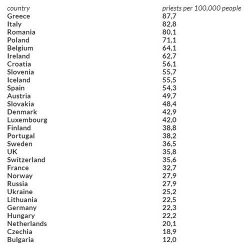 Η Ρωσία και η Ουκρανία βρίσκονται πολύ κάτω στον κατάλογο, με 27,9 ιερείς ανά 100.000 άτομα, ενώ η Βουλγαρία παραμένει πολύ πίσω με μόνο 12 ιερείς ανά 100.000 άτομα.