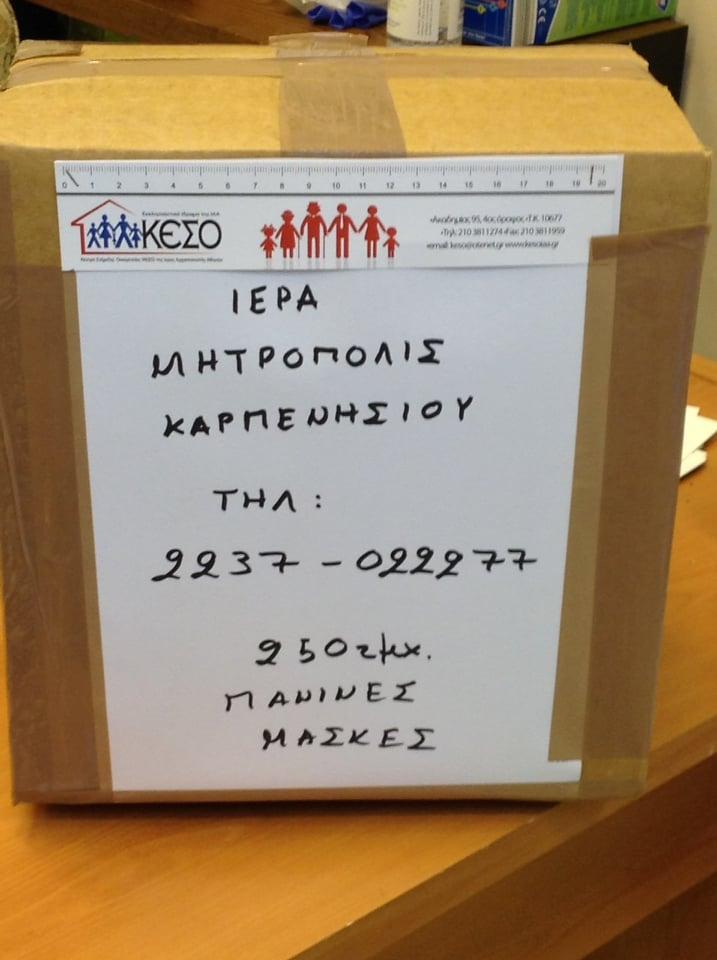 Η Διευθύντρια του ΚΕΣΟ κα Μαίρη Πίνη μέσω των εθελοντών Νίκου Σοφιανίδη και Κωνσταντίνου Σαλεβουράκη μερίμνησε, ώστε να σταλούν τάχιστα οι υφασμάτινες μάσκες στην Ι. Μ. Καρπενησίου και ο σεβασμιώτατος κ. Γεώργιος να ανταποκριθεί στην προσφορά της Μητρόπολης.