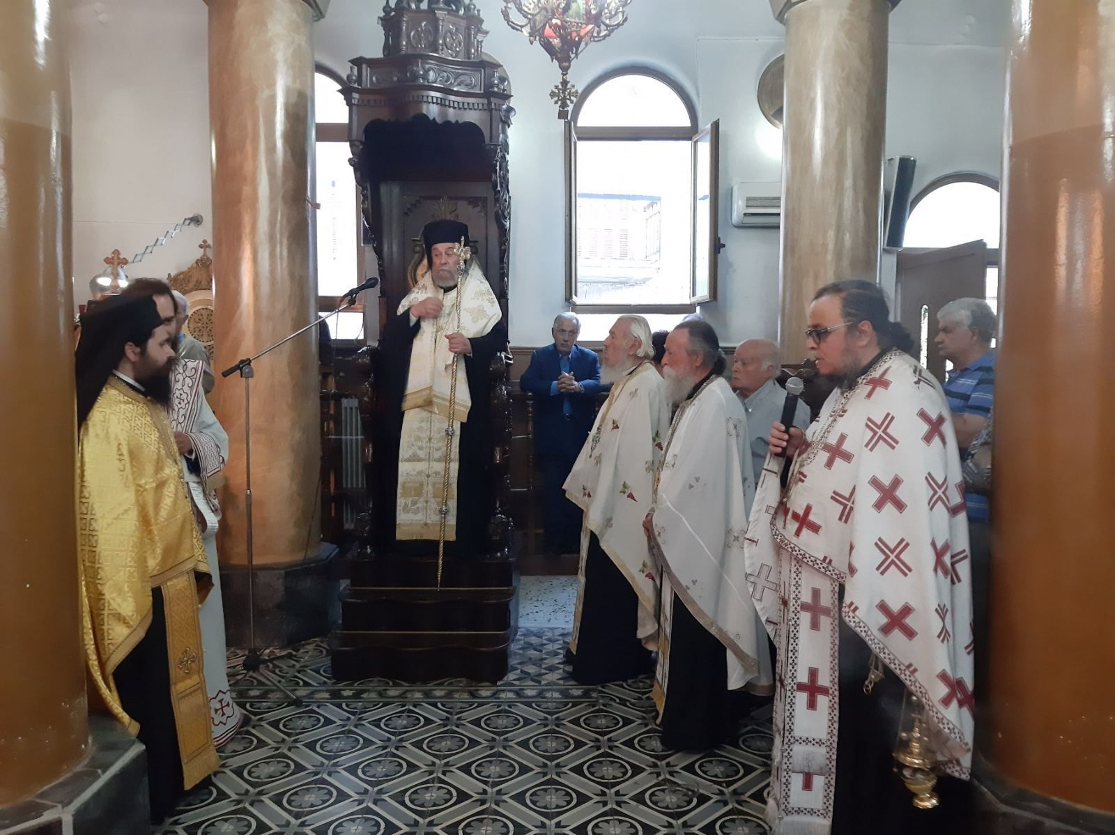 Εις τα αναλόγια απέδωσαν τους ύμνους εκ δεξιού χορού ο Πρωτοψάλτης του ιερού ναού κ. Αριστοτέλης Σαλαμπασόπουλος και εξ αριστερού χορού ο Πρωτοψάλτης του ιερού ναού Αγίου Γεωργίου Αλιβερίου κ. Χαράλαμπος Μαζαράκης με την συμετοχή και άλλων ιεροψαλτών.