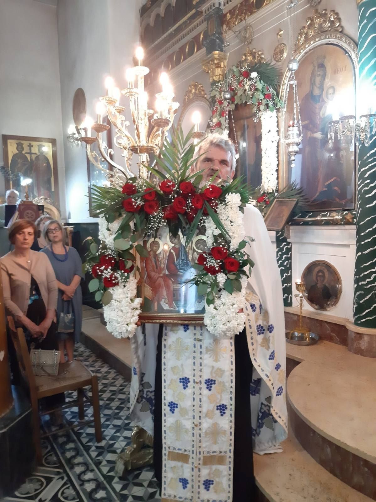 Ιδιαιτέρως δε εορτάστηκε στον φερώνυμο ιερό ναό της Αγίας Τριάδος, χωρίου Κριεζών επαρχίας Αλιβερίου, όπου τελέσθηκε ο Αρχιερατικός Πανηγυρικός Εσπερινός, χοροστατούντος του Σεβασμιωτάτου Ποιμενάρχου Μητροπολίτου Καρυστίας και Σκύρου, κ. Σεραφείμ πλαισιούμενος απο τον Πανοσ Αρχιμ Νικόδημο Τσιμόγιαννη Προϊσταμένου Ιερού Ναού Αγίου Γεωργίου Αλιβερίου και Ιεροκήρυκος Ιεράς Μητροπόλεως Καρυστίας ιερέων ωμόρων ενορίων, του εφημέριου του ιερού ναού Πρωτοπρ Αθανάσιου Τούντα και του Διακόνου Αποστόλου Μπάκουλη.