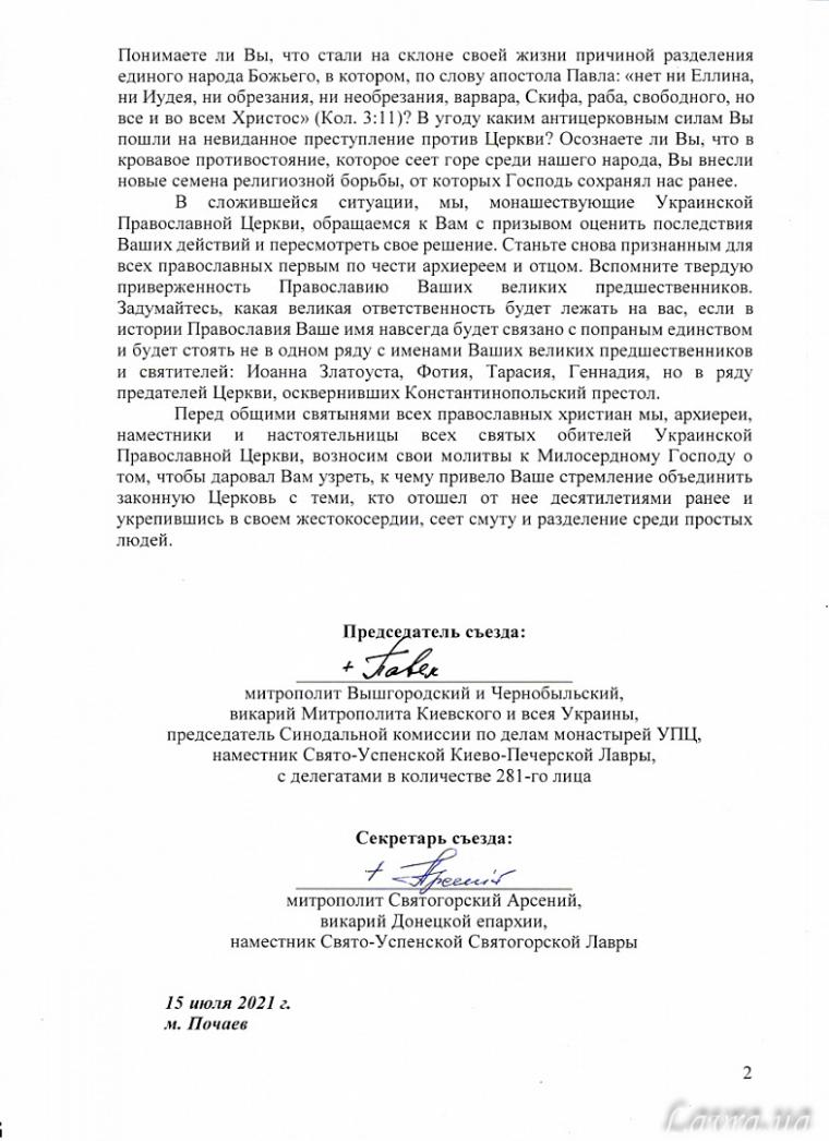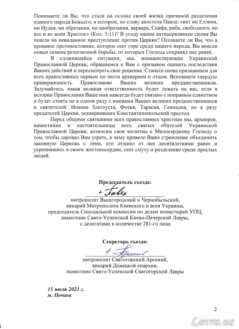 Ενώπιον των κοινών σεβασμάτων όλων των ορθοδόξων χριστιανών, εμείς οι αρχιερείς, καθηγούμενοι και καθηγουμένες όλων των ιερών καθιδρυμάτων της Ουκρανικής Ορθοδόξου Εκκλησίας αναπέμπουμε προσευχές στον Πανοικτίρμονα Θεό για να Σας προσφέρει τη χάρη να διαπιστώσετε πού οδήγησε η επιδίωξή Σας να ενώσετε τη νόμιμη Εκκλησία με εκείνους, που αποκόπηκαν από αυτήν προ δεκαετιών και, αφού εδραίωσαν τη σκληροκαρδία τους, σπέρνουν ταραχή και διχασμό ανάμεσα στους απλούς ανθρώπους».