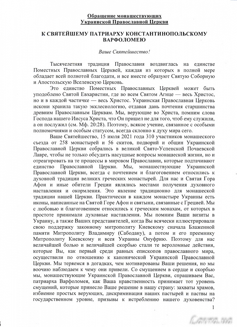 Παναγιώτατε, στις 15 Ιουλίου 2021 τριακόσιοι δέκα μετέχοντες στη μοναστική συνάθροιση εκ 258 ιερών μονών και 56 σκητών, μετοχίων και κοινοτήτων της Ουκρανικής Ορθοδόξου Εκκλησίας συνήλθαμε στη μεγάλη Λαύρα της Κοιμήσεως της Θεοτόκου στο Ποτσάγεφ, προκειμένου όχι μόνον να συζητήσουμε τα επίκαιρα ζητήματα του μοναχικού βίου, αλλά και να αντιδράσουμε σε εκείνες τις διαδικασίες στην παγκόσμια Ορθοδοξία, οι οποίες υπονομεύουν την ενότητα της Ορθοδόξου Εκκλησίας. Εμείς, οι μονάζοντες της Ουκρανικής Ορθοδόξου Εκκλησίας, πάντοτε με τιμή και ευλάβεια αντιμετωπίζαμε την πνευματική παράδοση των μεγάλων ελληνικών μονών. Για εμάς, και το Άγιον Όρος και οι άλλες ιερές μονές της Ελλάδας αποτελούσαν τόπους πνευματικής νουθεσίας και διαποιμάνσεως. Αυτό το φαινόμενο έχει καθιερωθεί στη μοναχική παράδοση της Εκκλησίας μας. Σχεδόν σε κάθε μοναστήρι της Ουκρανίας υπάρχουν εικόνες, που έχουν αγιογραφηθεί στο Άγιον Όρος και ιερά κειμήλια, που συνδέονται με την Ελλάδα. Με αγάπη και ευλάβεια αντιμετωπίζαμε τους Έλληνες μοναχούς, από τους οποίους με απλότητα λαμβάναμε πνευματικές νουθεσίες. Ενθυμούμαστε τις επισκέψεις Σας στην Ουκρανία, καθώς και των αντιπροσώπων Σας, όταν παντοιοτρόπως επιδεικνύατε την υποστήριξή Σας προς τον νόμιμο μητροπολίτη Κιέβου, αρχικώς τον αοίδιμο μητροπολίτη Βλαδίμηρο (Σαμποντάν) και στη συνέχεια τον διάδοχό του μητροπολίτη Κιέβου και πάσης Ουκρανίας Ονούφριο. Συνεπώς, προκάλεσαν σε μας μέγιστο πόνο και μέγιστη θλίψη εκείνες οι δόλιες ενέργειες, στις οποίες προβήκατε Εσείς, ως πρώτος μεταξύ ίσων επισκόπων του ορθοδόξου κόσμου, έναντι της κανονικής Ουκρανικής Ορθοδόξου Εκκλησίας. Υπάρχουν πολλές εικασίες για τα κίνητρα των ενεργειών Σας, ωστόσο είναι οφθαλμοφανές πού έχουν οδηγήσει. Με ταραχή στην καρδιά και με λύπη εμείς, οι μονάζοντες της Ουκρανικής Ορθοδόξου Εκκλησίας, ερωτούμε Εσάς, τον Πατριάρχη Βαρθολομαίο, πώς το ήθος Σας δέχεται το βαθμό των ταραχών, που προκάλεσε στη χώρα μας η απόφασή Σας: τις αρπαγές ναών, τους ξυλοδαρμούς απλών πιστών, τις διακρίσεις σε βάρος των ποιμένων και του ποιμνίου μας σε πολιτειακό επίπεδο, τις εκκλήσεις να εξοντωθεί ο ιερός μας κλήρος; Αντιλαμβάνεσθε ότι στη δύση της ζωής Σας σταθήκατε αιτία διχασμού του ενιαίου λαού του Θεού, όπου σύμφωνα με τον Απόστολο Παύλο: «οὐκ ἔνι ῞Ελλην καὶ ᾿Ιουδαῖος, περιτομὴ καὶ ἀκροβυστία, βάρβαρος, Σκύθης, δοῦλος, ἐλεύθερος, ἀλλὰ τὰ πάντα καὶ ἐν πᾶσι Χριστός» (Κολ. 3.11); Με σκοπό να ευαρεστήσετε ποιες αντιεκκλησιαστικές δυνάμεις διαπράξατε το πρωτοφανές έγκλημα κατά της Εκκλησίας; Έχετε άραγε επίγνωση ότι στην αιματηρή αντιπαράθεση, η οποία σπέρνει τη συμφορά εντός του λαού μας, Εσείς ρίξατε νέους σπόρους θρησκευτικών συγκρούσεων, από τους οποίους μας διαφύλασσε στο παρελθόν ο Κύριος;