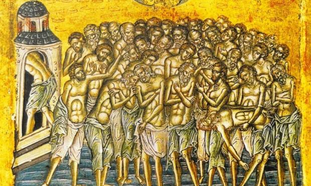 Τὴν θεοσύλλεκτον, τοῦ Λόγου φάλαγγα, τοὺς Τεσσαράκοντα καὶ δυὸ Μάρτυρας, τοὺς ἐν μίᾳ πάντας σπουδή, ἀθλήσαντας τιμήσωμεν οὗτοι γὰρ τῆς πίστεως, ἡνωμένοι τὴ χάριτι, δῆμον ἀκαθαίρετον, ἱερῶς συνεκρότησαν, καὶ ὤφθησαν Χριστοῦ κληρονόμοι, ξίφει τμηθέντες τοὺς αὐχένας.