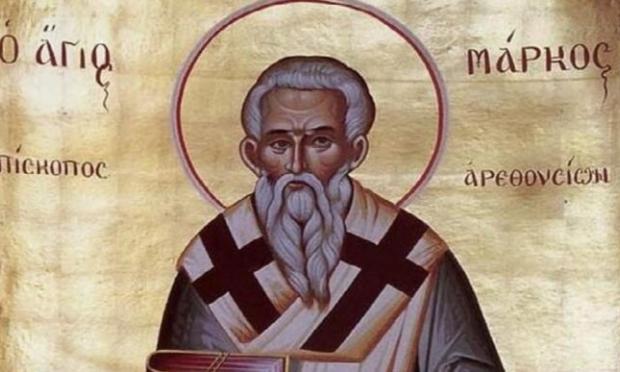 Ο άγιος Μάρκος έζησε τον 4ο αιώνα, τα χρόνια του Μ. Κωνσταντίνου (312-337, του Κωνστάντιου (337-361) και Ιουλιανού (361-363). Δε γνωρίζουμε δυστυχώς τίποτε για την πρότερη ζωή του. Εκλέχτηκε και χειροτονήθηκε επίσκοπος Αρεθουσίων, η οποία βρισκόταν στα ανατολικά της Θεσσαλονίκης, προφανώς για την ευσέβειά του και το ζήλο του για την Εκκλησία. Φαίνεται ότι άσκησε την επισκοπική του διακονία με συνέπεια και γι’ αυτό απέκτησε τη φήμη του δυναμικού επισκόπου. Το 341 έλαβε μέρος στη Σύνοδο της Αντιόχειας. Το 343 έλαβε μέρος στη Σύνοδο της Φιλιππουπόλεως, το 351 στη Σύνοδο του Σιρμίου και το 358 στη Σύνοδο της Σελεύκειας. Ιδιαιτέρως αγωνίστηκε κατά της ειδωλολατρίας, μεταστρέφοντας πλήθος ειδωλολατρών στην Εκκλησία του Χριστού και στη σωτηρία. Είχε όμως αντιπάλους τους σκοταδιστές ειδωλολάτρες ιερείς, οι οποίοι βλέποντας να ερημώνουν τα «ιερά» τους και ως εκ τούτου οι πρόσοδοί τους, φανάτιζαν τους ειδωλολατρικούς όχλους, οι οποίοι βιαιοπραγούσαν κατά των χριστιανών κληρικών, θεωρώντας τους υπεύθυνους για την μεταστροφή των ειδωλολατρών στην χριστιανική πίστη.