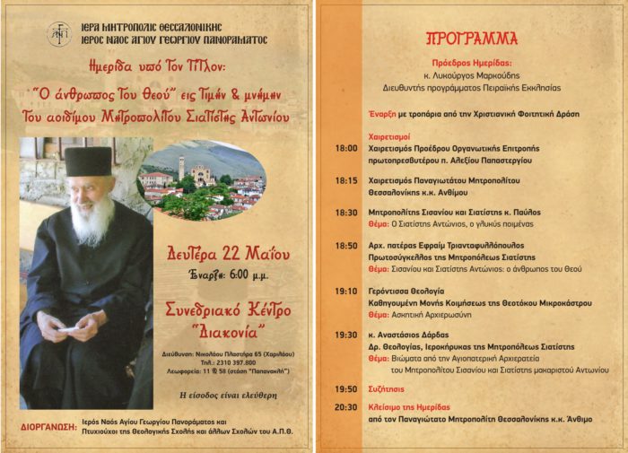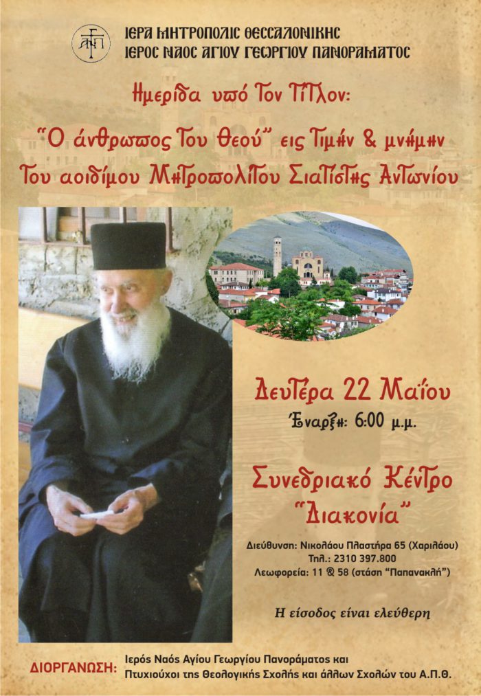 Τη Δευτέρα 22 Μαΐου 2017 και ώρα 6 το απόγευμα, στο Συνεδριακό Κέντρο Διακονία θα πραγματοποιηθεί Ημερίδα στη μνήμη του αοιδίμου Μητροπολίτη Σιατίστης Αντωνίου με θέμα: «Ο άνθρωπος του Θεού». Η ημερίδα τελεί υπό την αιγίδα του Παναγιωτάτου Μητροπολίτη Θεσσαλονίκης κ.κ. Ανθίμου και συνδιοργανώνεται από τον Ιερό Ναό Αγίου Γεωργίου Πανοράματος Θεσσαλονίκης και Πτυχιούχους της Θεολογικής Σχολής και άλλων Σχολών του Α.Π.Θ..