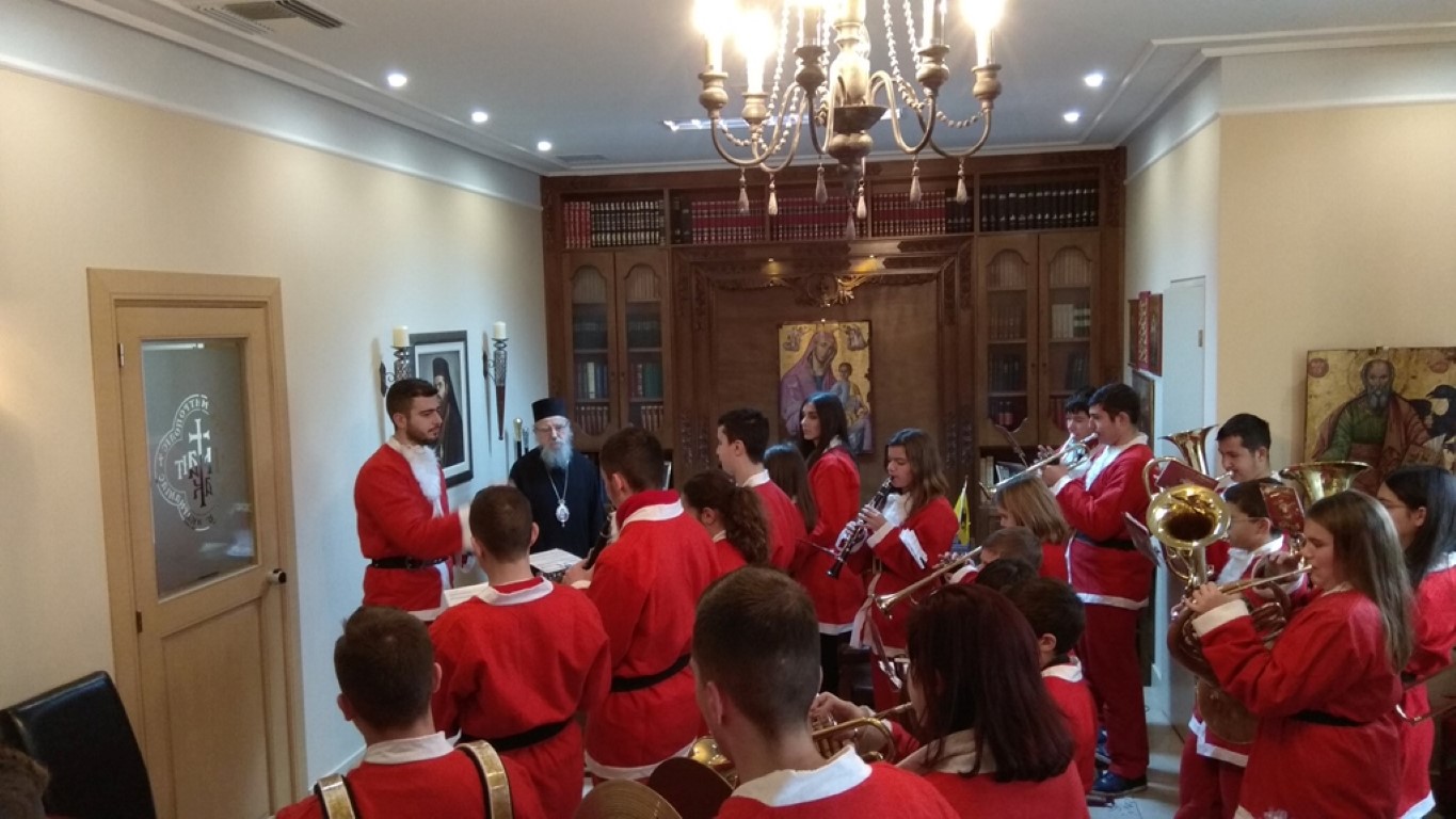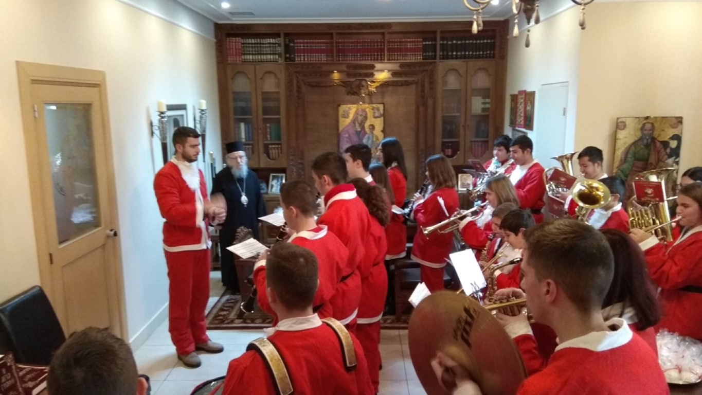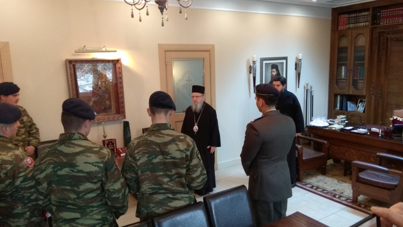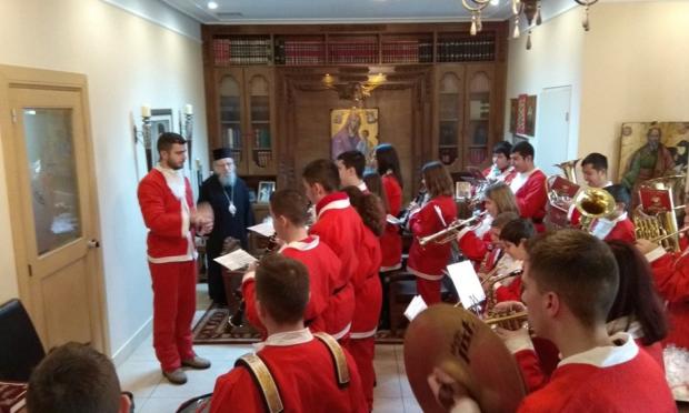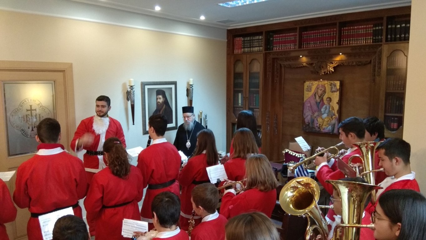 Την Παρασκευή 22 Δεκεμβρίου 2017 ο Σεβασμιώτατος Ποιμενάρχης μας, Μητροπολίτης Αιτωλίας και Ακαρνανίας κ. Κοσμάς δέχθηκε στα Γραφεία της Ιεράς Μητροπόλεως, στην Ιερά Πόλη Μεσολογγίου, αντιπροσωπεία στρατιωτών του 2/39 Συντάγματος Ευζώνων και τη Φιλαρμονική της Ιεράς Πόλεως Μεσολογγίου «Ιωσήφ Ρωγών», που έψαλλαν τα κάλαντα καθώς και άλλα επίκαιρα τραγούδια και ύμνους.