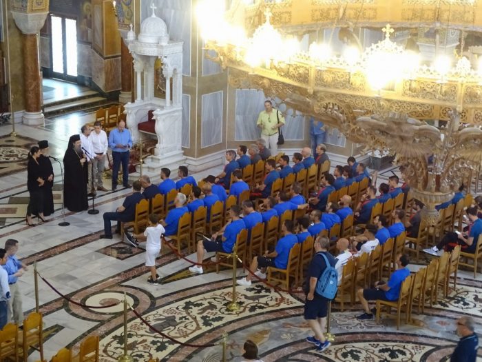 Στὸν Ἱερὸ Ναὸ τοὺς ὑπεδέχθη ὁ Σεβασμιώτατος Μητροπολίτης Πατρῶν κ.κ. Χρυσόστομος, ὁ ὁποῖος τοὺς μίλησε μὲ πατρικὴ ἀγάπη καὶ τοὺς ἐπήνεσε γιὰ τὸ ἦθος τους, γιὰ τοὺς ἀθλητικούς τους ἀγῶνες μέσα ἀπὸ τοὺς ὁποίους ἔδωσαν μεγάλη χαρὰ στὴν Πατρίδα μας καὶ γιὰ τὴν πίστη τους στὸν Θεὸ καὶ τὴν εὐσέβειά τους.