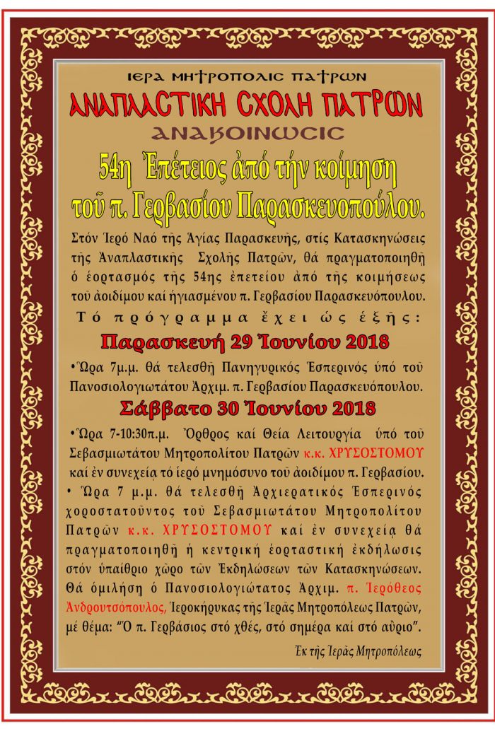 Στόν Ἱερό Ναό τῆς Ἁγίας Παρασκευῆς, στίς Κατασκηνώσεις τοῦ π. Γερβασίου στά Συχαινά τῶν Πατρῶν, θά πραγματοποιηθῇ ὁ ἑορτασμός τῆς 54ης ἐπετείου ἀπό τῆς κοιμήσεως τοῦ ἀοιδίμου καί ἡγιασμένου π. Γερβασίου Παρασκευοπούλου.