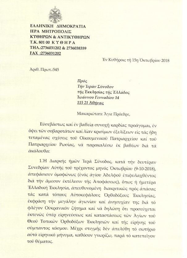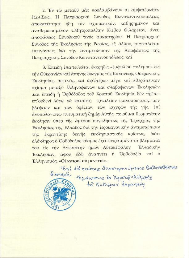 - Ἐπειδή ἐπαπειλεῖται ἔκκρηξις «ἐμφυλίου πολέμου» εἰς τήν Οὐκρανίαν καί ἀπηνής διωγμός τῆς Κανονικῆς Οὐκρανικῆς Ἐκκλησίας, ἀφ΄ἑνός, καί ἀφ΄ἑτέρου μέγα καί ἀθεράπευτον σχίσμα μεταξύ ἑλληνοφώνων καί σλαβοφώνων Ἐκκλησιῶν ,καί ἐπειδή ἡ Ὀρθόδοξος τοῦ Χριστοῦ Ἐκκλησία δέν πρέπει ἐπ΄οὐδενί λόγῳ νά καταστῇ ἐργαλεῖον ἱκανοποιήσεως τῶν βλέψεων καί τῶν ὀρέξεων τῶν ἰσχυρῶν τῆς γῆς, ἐπί ἀνυπολόγιστῳ πνευματικῇ ζημίᾳ Αὐτῆς, ποιοῦμαι θερμοτάτην ἔκκλησιν ὑπέρ τῆς ἀμέσου συγκλήσεως τῆς Ἱεραρχίας τῆς Ἐκκλησίας τῆς Ἑλλάδος διά τήν ἱεροκανονικήν ἀντιμετώπισιν τῆς ἐκραγείσης δεινῆς ἐκκλησιαστικῆς κρίσεως, διότι ὁλόκληρος ὁ Ὀρθόδοξος κόσμος ἔχει ἐστραμμένα τά βλέμματά του εἰς τήν Ἁγιωτάτην ἡμῶν Αὐτοκέφαλον Ἑλλαδικήν Ἐκκλησίαν, ἀφοῦ ἐδῶ ἀναπνέει ἡ Ὀρθοδοξία καί ὁ Ἑλληνισμός. «Οἱ καιροί οὐ μενετοί».