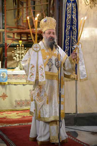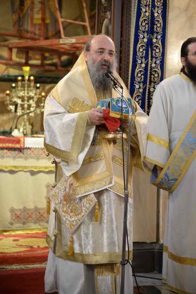 Στὴν ὁμιλία του ὁ Σεβασμιώτατος ἀνεφέρθη στὴ θαυμαστὴ Σκέπη καὶ προστασία τῆς Παναγίας στὸν Ἑλληνικὸ Λαὸ καὶ μάλιστα κατὰ τὴν συγκεκριμένη χρονικὴ περίοδο, κατὰ τὴν ὁποία ὁ Λαὸς μας ἔγραψε σελίδες δόξης μὲ ἀγῶνες καὶ αἱματηρὲς θυσίες, νικώντας καὶ ἐξευτελίζοντας τὸ τέρας τοῦ φασισμοῦ καὶ ἐκεῖνο τοῦ ναζισμοῦ.