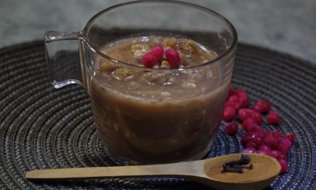 Όταν λιώσει και η ζάχαρη, σβήνουμε και προσθέτουμε το ταχίνι. Ανακατεύουμε καλά και αδειάζουμε σε μπολάκια.Σε κάθε μπολάκι, βάζουμε από πάνω 1 κουταλιά καρύδια, κανέλα και στολίζουμε με 1 χουρμά και 1 δαμάσκηνο.
