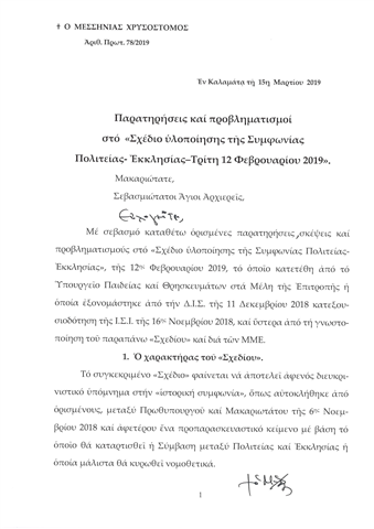 Κείμενο του Μητροπολίτου Μεσσηνίας, με τις θέσεις του για το σχέδιο υλοποίησης της συμφωνίας Ποιτείας-Εκκλησίας δόθηκε στην δημοσιότητα, ενώ έχει ήδη κοινοποιηθεί προς τον Αρχιεπίσκοπο και τους Μητροπολίτες.