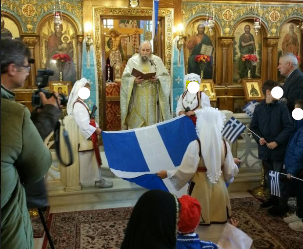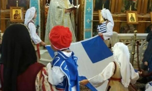 Η είσοδος της Σημαίας εις τον Ιερόν Ναόν πραγματοποιήθηκε ψαλλωμένου υπό όλου του εκκλησιάσματος του εθνικού ύμνου της Εκκλησίας μας «Τη Υπερμάχω Στρατηγώ τα Νικητήρια» και απαγγελωμένου εμμελώς του εμβατηρίου «όλη δόξα , όλη χάρη» υπό ευσεβούς συμπολίτη μας.