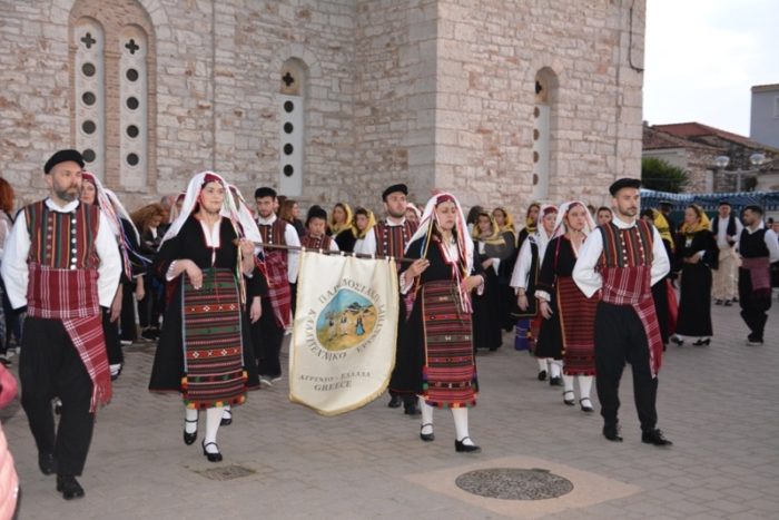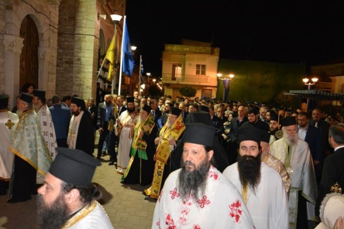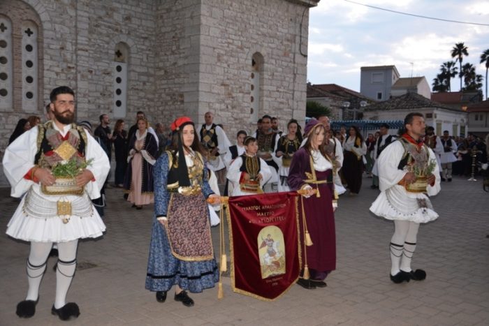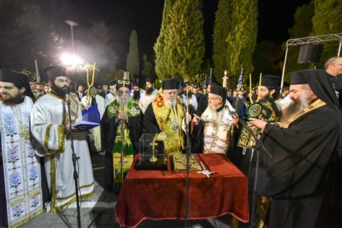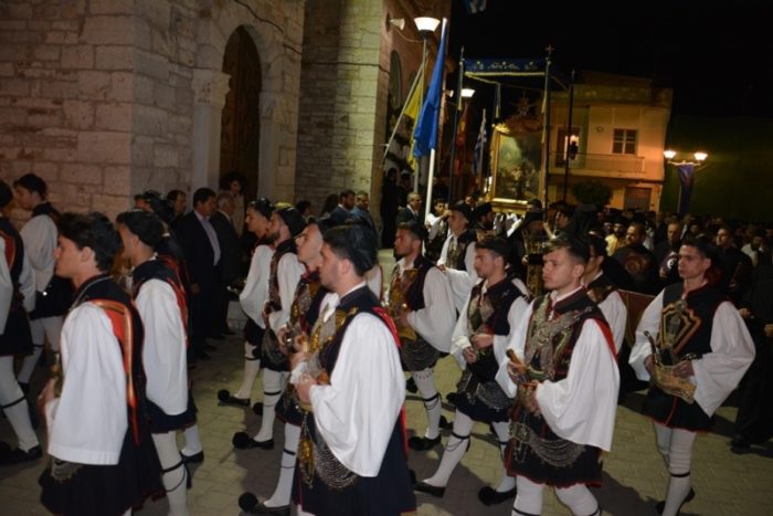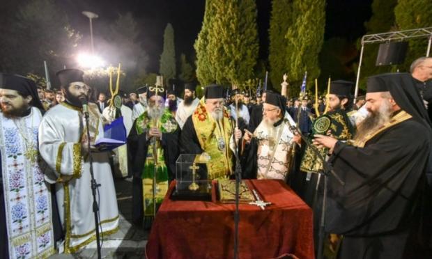 Ακολούθησε η λιτανευτική πομπή, από τον Ιερό Ναό στον Κήπο των Ηρώων, με επικεφαλής την Εικόνα της Εξόδου και τον Σταυρό ευλογίας του Επισκόπου Ρωγών Ιωσήφ. Μετείχαν οι Σεβασμιώτατοι Αρχιερείς, ο ιερός κλήρος και οι αρχές του τόπου, μαζί με χιλιάδες μέλη από αντιπροσωπίες πολιτιστικών συλλόγων και φιλαρμονικές από όλη την Ελλάδα, καθώς και τιμητικά αγήματα των τριών Σωμάτων του Ελληνικού Στρατού με τις φιλαρμονικές τους.