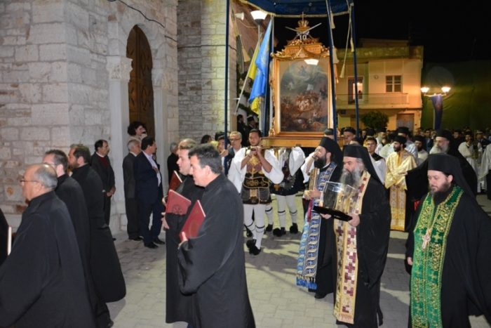 Το Σάββατο το πρωί, κατά την καθιερωμένη τάξη, μεταφέρθηκε στον Ιερό Ναό, με λιτανευτική πομπή από το Μουσείο Ιστορίας και Τέχνης, η Εικόνα της Εξόδου και ο Σταυρός Ευλογίας του Επισκόπου Ρωγών Ιωσήφ. Στην πομπή συμμετείχαν ο Σεβασμιώτατος Ποιμενάρχης μας, ο Δήμαρχος της Ιεράς Πόλεως Μεσολογγίου, οι στρατιωτικές και πολιτικές αρχές της Ιεράς Πόλεως και της ευρύτερης περιοχής και πλήθος κόσμου.