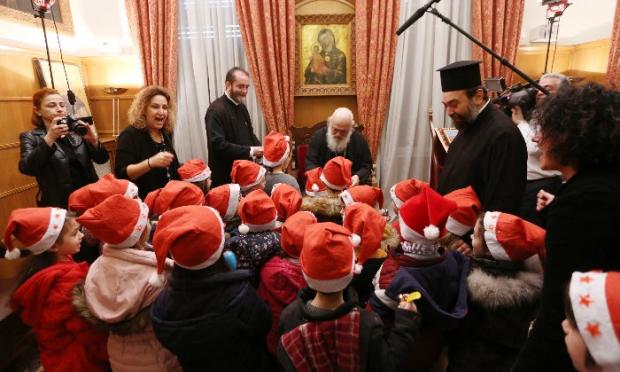 Μαθητές από διάφορα σχολεία και μέλη από χορωδίες φορέων και συλλόγων έψαλλαν τα κάλαντα και παραδοσιακά χριστουγεννιάτικα τραγούδια στον Αρχιεπίσκοπο Αθηνών και πάσης Ελλάδος κ. Ιερώνυμο, με αφορμή την εορτή των Χριστουγέννων.