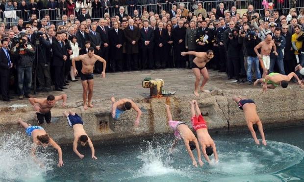 Πενήντα περίπου νέοι ἒπεσαν παρά τό δριμύ ψῦχος στά νερά τοῦ Πατραϊκοῦ γιά νά ἀνασύρουν τόν Τίμιο Σταυρό.
