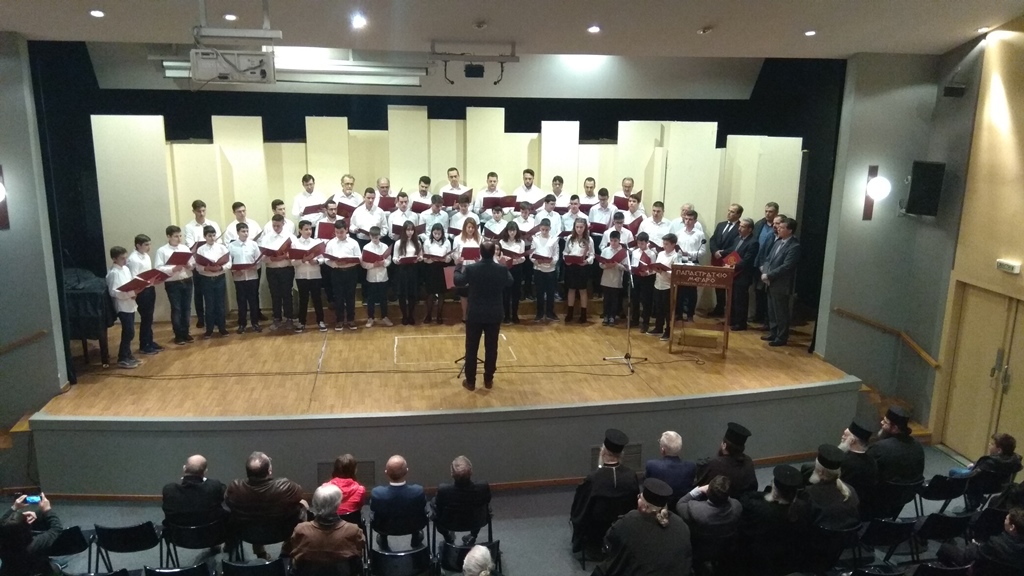 Στο δεύτερο μέρος της εορταστικής εκδήλωσης, η χορωδία της Σχολής Βυζαντινής Μουσικής Αγρινίου «ΔΑΥΙΔ Ο ΨΑΛΜΩΔΟΣ» της Ιεράς Μητροπόλεως, απέδωσε θαυμάσια ύμνους και ψαλτοτράγουδα, υπό την διεύθυνση του καθηγητού κ. Κωνσταντίνου Λανάρα.