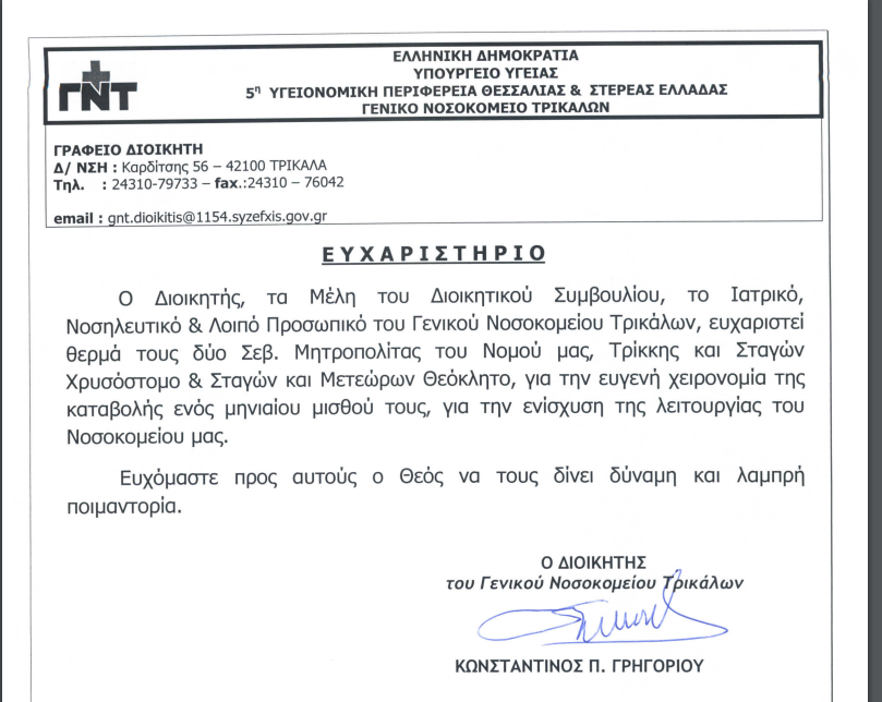 Ο Διοικητής, τα Μέλη του Διοικητικού Συμβουλίου, το Ιατρικό, Νοσηλευτικό & Λοιπό Προσωπικό του Γενικού Νοσοκομείου Τρικάλων, ευχαριστεί θερμά τους δύο Σεβ. Μητροπολίτας του Νομού μας, Τρίκκης και Σταγών Χρυσόστομο & Σταγών και Μετεώρων Θεόκλητο, για την ευγενή χειρονομία της καταβολής ενός μηνιαίου μισθού τους, για την ενίσχυση της λειτουργίας του Νοσοκομείου μας.