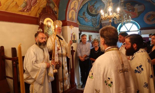 Ευχαρίστησε την επιμελήτρια του Ναού κα Βασιλική Μαγουλά για τη μέριμνά της προς αυτόν, συνεχάρη τους διακονήσαντες το Αναλόγιο κ.κ. Φραγκίσκο Χανιώτη, φιλόλογο, και Μιχαήλ Τριανταφυλλίδη, καλωσόρισε τους Τακτικούς Καθηγητές της Ιατρικής στο Πανεπιστήμιο Δυτικής Αττικής κ.κ. Δημητριο και Φραγκίσκο Χανιώτη, και ευχήθηκε σε όλους για την επιούσα Θεομητορική εορτή της Κοιμήσεως της Θεοτόκου.