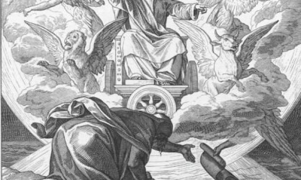 Ο προφήτης βλέπει ένα ουράνιο άρμα. Βλέπει τέσσερα ανθρώπινα ομοιώματα, που αργότερα (κεφ. 10) τα ονομάζει Χερουβείμ, να υποβαστάζουν το θρόνο του Θεού. Το κάθε Χερουβείμ είχε τέσσερα ομοιώματα προσώπου ανθρώπου, λιονταριού, βοδιού και αετού, τα οποία έβλεπαν προς τις τέσσερις κατευθύνσεις του ορίζοντα. Επίσης, το κάθε Χερουβείμ είχε τέσσερις φτερούγες. Οι δύο ήταν προς τα πάνω και οι άλλες δύο σκέπαζαν το σώμα τους. Δίπλα από τα Χερουβείμ υπήρχαν τέσσερις τροχοί και ο κάθε τροχός είχε άλλον τροχό μέσα του έτσι ώστε το άρμα μπορούσε να κινηθεί προς όλες τις κατευθύνσεις χωρίς να στρέφονται οι τροχοί. Πάνω από τα Χερουβείμ υπήρχε ένα στερέωμα και πάνω στο στερέωμα ήταν ένα ομοίωμα θρόνου. Ο Ιεζεκιήλ είδε στο θρόνο ένα ομοίωμα ανθρώπου ο οποίος ήταν περικυκλωμένος από απερίγραπτη λάμψη.