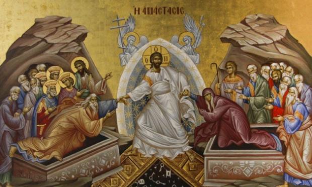 Κατά το βαθύ όρθρο, όμως, της Κυριακής, η οποία ονομάζεται από τους Ευαγγελιστές «πρώτη Σαββάτου» και «μία Σαββάτων», δηλαδή πρώτη μέρα της εβδομάδος, μετά από τριάντα έξι σχεδόν ώρες από τη νέκρωση του ζωοδότη Λυτρωτή, έρχονται με νεκρώσιμα αρώματα στον τάφο. Και ενώ σκέπτονταν τη δυσκολία της αποκυλίσεως του λίθου από την είσοδο του τάφου γίνεται σεισμός φοβερός, και Άγγελος με αστραπηφόρα όψη και χιονόφωτη στολή, αφού αποκύλισε τον λίθο και κάθισε πάνω σε αυτόν, έκανε τους φύλακες να τρομάξουν και τους έτρεψε σε φυγή.