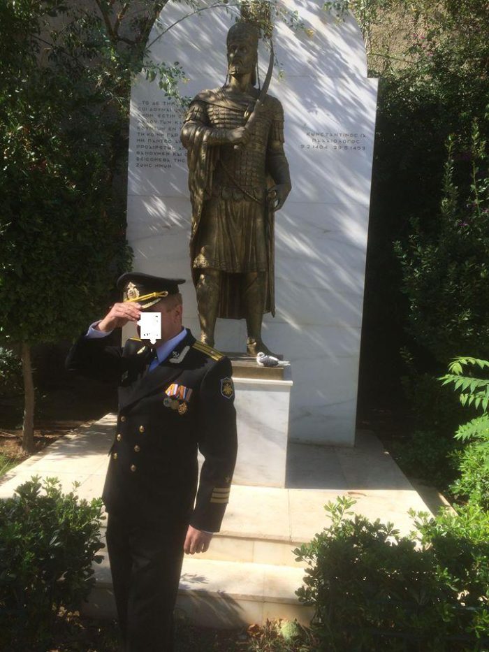 Μα τέτοια αγάπη και καμάρι μπροστά στον περίτεχνο μαρμάρινο   ανδριάντα του Κωνσταντίνου Παλαιολόγου που βρίσκεται στην πλατεία της Μητρόπολης των Αθηνών   που έδειξαν ανώτεροι αξιωματικοί του Ρωσικού πολεμικού ναυτικού δεν συναντήσαμε άλλη φορά.