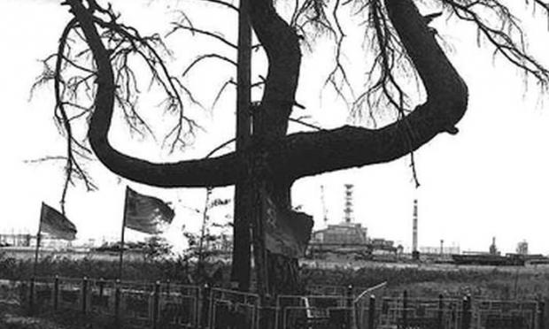 Το πεύκο, αριστερά, στο οποίο σταμάτησε το ραδιενεργό σύννεφο και χωρίστηκε, έχει τα χονδρά κλωνάρια του σε σχήμα σταυρού. Είναι γνωστό και από τη Γερμανική κατοχή της Ουκρανίας, γιατί εκεί είχαν κρεμάσει οι Γερμανοί πολλούς πατριώτες και αποτελεί μνημείο.