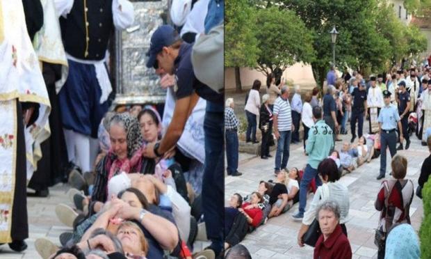 Πιστοί ξαπλώνουν στο έδαφος και δημιουργούν μία ανθρώπινη αλυσίδα για να περάσει από πάνω τους το λείψανο, ενώ ακούγονται τρομακτικές κραυγές.