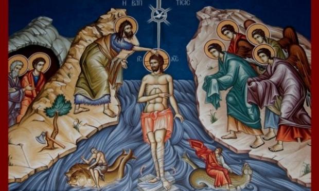 «Δεύτε ουν, ίδετε παράδοξα θαύματα»1. Ο Ήλιος της Δικαιοσύνης λούζεται στου Ιορδάνη τα νερά. Η φωτιά βουτάει και σμίγει με τα νερά. Και ο Θεός από άνθρωπο αγιάζεται2.