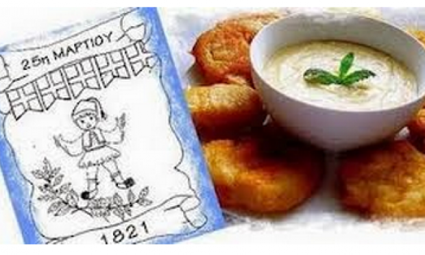 Παραδοσιακό έδεσμα της ημέρας του Ευαγγελισμού, η οποία έχει πια διττή σημασία για τον Ελληνισμό, καθώς συμπίπτει από το 1838 με τον εορτασμό της Επανάστασης του 1821, είναι ο μπακαλιάρος και μάλιστα συνοδεία της γνωστής σκορδαλιάς.