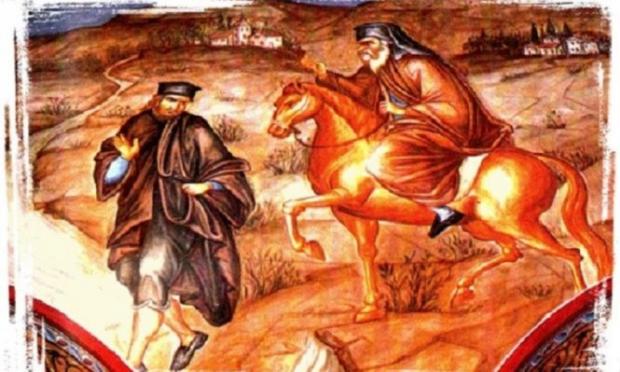 Λίγο αργότερα συνάντησαν έναν χείμαρρο που ήταν αδύνατο να περάσουν. Τότε ο Άγιος ευλόγησε τον χείμαρρο, ο οποίος σταμάτησε αφήνοντας τον Άγιο και τον συνοδό του να περάσουν.