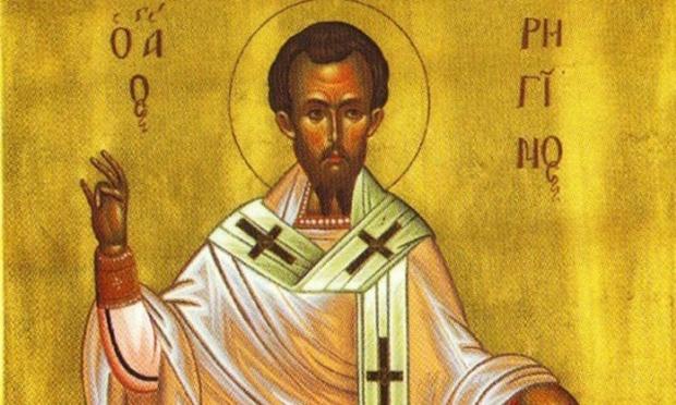 Ήταν έλληνας στην καταγωγή και γεννήθηκε στις αρχές του 4ου αιώνα στη Λειβαδιά της Βοιωτίας από ευσεβείς και ενάρετους γονείς. Έχοντας αυτοί οικονομική και κοινωνική θέση στην τοπική κοινωνία, έδωσαν στο γιό τους σοβαρή μόρφωση. Τον έστειλαν σε ονομαστές σχολές της εποχής, όπου σπούδασε την θύραθεν παιδεία. Παράλληλα φρόντισαν να γεμίσουν την ψυχή του με πίστη στο Θεό και ευσέβεια και τον στόλισαν με αρετές. Τον κατήχησαν στην ορθόδοξη πίστη και τον έμαθαν πως να ξεχωρίζει τις πλάνες, οι οποίες την εποχή εκείνη, αλλά και κάθε εποχή, τείνουν να νοθεύσουν τη σώζουσα αλήθεια της Εκκλησίας μας και να αναστείλουν το σωστικό της έργο. Έτσι ο Ρηγίνος κατέστη ενωρίς μια ολοκληρωμένη προσωπικότητα, ένας χαριτωμένος άνθρωπος, κατοικητήριο του Αγίου Πνεύματος.