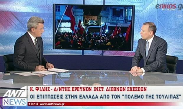 Για τις επιπτώσεις στην Ελλάδα από τον «πόλεμο της τουλίπας» μίλησε στο κεντρικό δελτίο ειδήσεων του ΑΝΤ1 με τον Νίκο Χατζηνικολάου, ο Κωνσταντίνος Φίλης, Διευθυντής ερευνών του Ινστιτούτου Διεθνών Σχέσεων.
