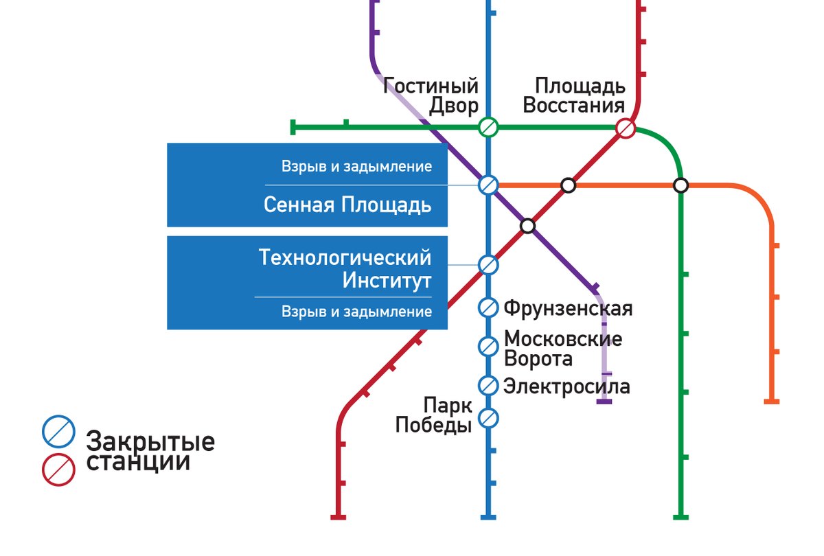 Όπως διαπιστώθηκε, η έκρηξη σημειώθηκε σε έναν συρμό τη στιγμή που βρισκόταν ανάμεσα σε δύο σταθμούς, τον Σέναγια Πλόσαντ και εκείνον του Τεχνολογικού Ινστιτούτου, στα νοτιοδυτικά της πόλης. Εμπειρογνώμονες έχουν σταλεί επιτόπου για να συγκεντρώσουν τα πρώτα στοιχεία για την έρευνα, ανακοίνωσε η εισαγγελία της Αγίας Πετρούπολης.