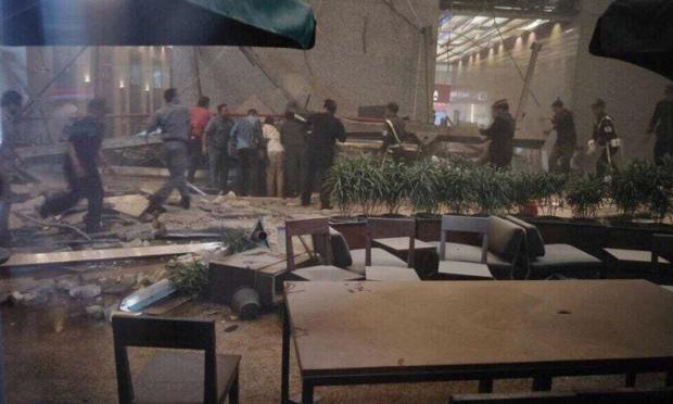 Πλάνα των τηλεοπτικών σταθμών δείχνουν να έχει καταρρεύσει μία μεταλλική κατασκευή γύρω από ένα τοπικό καφέ και κοντά στην είσοδο του πολυόροφου κτιρίου. Στα ίδια τηλεοπτικά πλάνα, άνθρωποι κάθονται στα σκαλιά του κτιρίου.