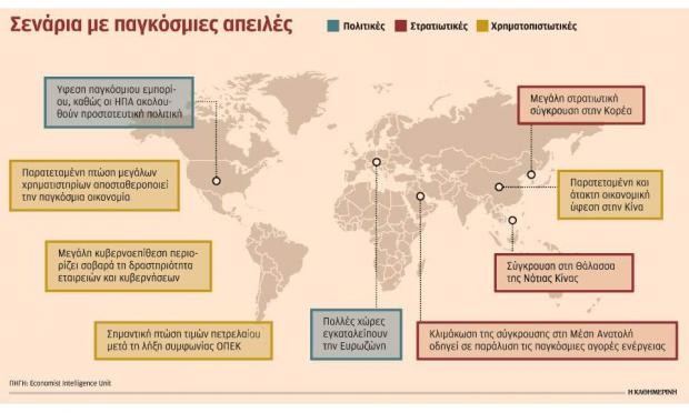 Οι χώρες που θα εγκατέλειπαν την Ευρωζώνη υπό πίεση θα υφίσταντο μεγάλη υποτίμηση του νομίσματός τους και θα ήταν αδύνατο να εξυπηρετήσουν τα χρέη τους σε ευρώ. Με τη σειρά τους οι τράπεζες θα υφίσταντο τεράστιες ζημίες εξαιτίας των κρατικών ομολόγων που θα έχουν στο χαρτοφυλάκιό τους και η παγκόσμια οικονομία θα εισερχόταν σε ύφεση», προειδοποιούν οι συντάκτες της έκθεσης. Από τις υπόλοιπες εννέα δυνητικές απειλές ξεχωρίζουν η ύφεση του παγκόσμιου εμπορίου, που θα μπορούσε να προκληθεί από την υιοθέτηση σκληρής προστατευτικής πολιτικής από τον Αμερικανό πρόεδρο Ντόναλντ Τραμπ. Ο μεγαλύτερος φόβος είναι πως οι ΗΠΑ θα αποχωρήσουν από τη συμφωνία ελευθέρου εμπορίου της Βορείου Αμερικής (Nafta) και θα επιβάλουν εμπορικές κυρώσεις στην Κίνα, η οποία θα αντιδράσει δυσανάλογα πυροδοτώντας πλήρους κλίμακας εμπορικό πόλεμο με τις ΗΠΑ. Οι στρατιωτικού τύπου απειλές σχετίζονται με την παρακμή της αμερικανικής παγκόσμιας ηγεμονίας και από τις πλέον πιθανές είναι η σύγκρουση με την Κίνα, με αφορμή εδαφικές και θαλάσσιες διεκδικήσεις στη Θάλασσα της Νότιας Κίνας. Οι επιπτώσεις για την παγκόσμια και περιφερειακή οικονομία θα ήταν μεγάλες, ενώ θα υπήρχε και μεγάλη αναταραχή στο θαλάσσιο εμπόριο.