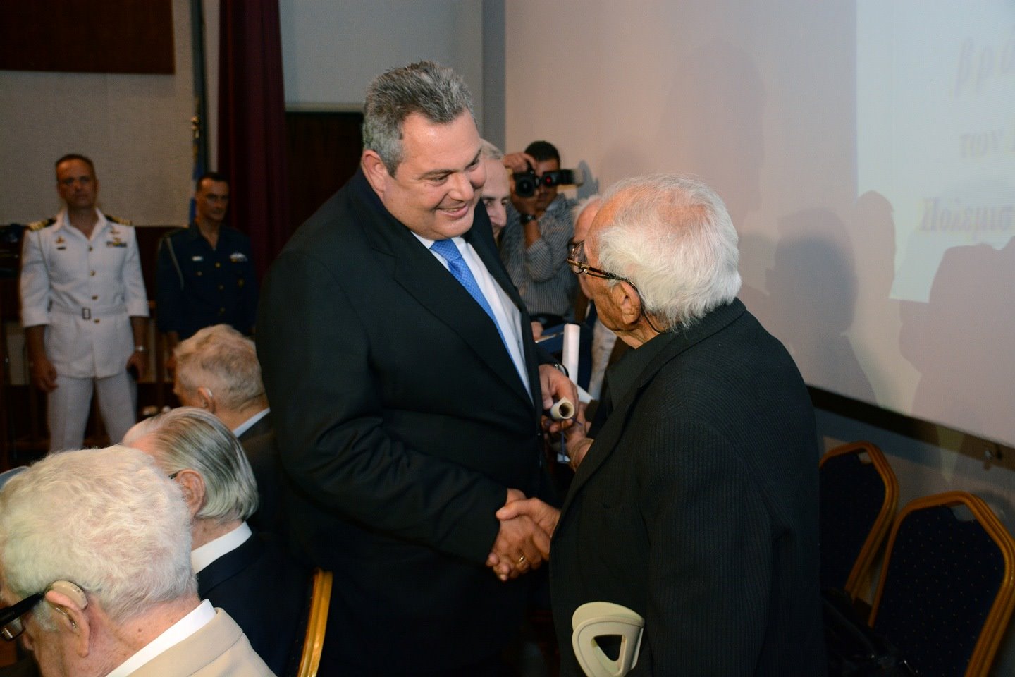 "Η σημερινή τελετή δεν αποπληρώνει το χρέος τιμής προς τους παλαίμαχους υπερασπιστές της εθνικής μας κυριαρχίας και της εδαφικής μας ακεραιότητας, αλλά αποτελεί το έναυσμα για την ανάληψη και εκτέλεση των επιβαλλόμενων υποχρεώσεων μας, έναντι υμών και των μελλοντικών γενεών." είπε μεταξύ άλλων ο Πάνος Καμμένος από την τελετή βράβευσης βετεράνων πολεμιστών του Δευτέρου Παγκοσμίου Πολέμου.