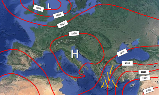 Το Μουσωνικό χαμηλό είναι ένα θερμικό χαμηλό που δημιουργείται πάνω από την ευρύτερη περιοχή της Ινδικής χερσονήσου κατά τη διάρκεια του καλοκαιριού, οι χαμηλές πιέσεις του οποίου επεκτείνονται έως τη Νοτιοανατολική Μεσόγειο και την Κύπρο. Έτσι η μέση πίεση κατά τη διάρκεια της θερμής περιόδου στην Ανατολική Μεσόγειο είναι ίση περίπου 1004 mb, μία πίεση αρκετά χαμηλή, που όμως δεν ευνοεί τις ανοδικές κινήσεις και έτσι τη δημιουργία καιρικών φαινομένων. Οι χαμηλές αυτές πιέσεις όμως συνδυαζόμενες με τις υψηλές πιέσεις που επικρατούν κατά τη διάρκεια του καλοκαιριού πάνω από τα Βαλκάνια και την Κεντρική Ευρώπη, προκαλούν έναν ισχυρό συνδυασμό ή καλύτερα βαροβαθμίδα, με αποτέλεσμα τη δημιουργία ενός ενισχυμένου βορείου ρεύματος πάνω από το Αιγαίο. Γιατί όμως τα μελτέμια δεν επηρεάζουν το Ιόνιο; Η απάντηση σε αυτό το ερώτημα, σύμφωνα με τον κ. Μαζαράκη, σχετίζεται με την τοπογραφία της χώρας μας, κύριο χαρακτηριστικό της οποίας είναι η διαμήκης παρουσία με διεύθυνση βοράς – νότος του ορεινού όγκου της Πίνδου. Έτσι οι ψηλές οροσειρές της Ηπείρου, της Θεσσαλίας, της Στερεάς και της Πελοποννήσου «εμποδίζουν» τη ροή του μελτεμιού να φτάσει στο Ιόνιο και έτσι κατά τη διάρκεια ενός επεισοδίου μελτεμιού, στο Ιόνιο επικρατούν ασθενείς άνεμοι ή ανατολικοί – βορειοανατολικοί, συνήθως ασθενείς και ελαφρώς ενισχυμένοι σε μέτριους ή ισχυρούς, μόνο στον Πατραϊκό, σημειώνει το e-nautilia.gr.