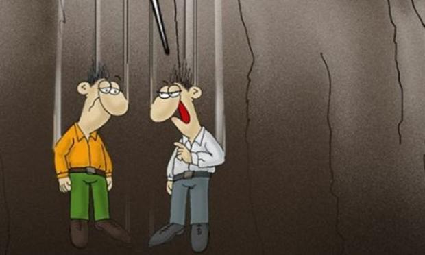 Περιγράφοντας τη βουτιά στο κενό που φαίνεται ότι κάνει η ελληνική οικονομία, όπως αυτό αποτυπώνεται και στην κατάσταση στο ελληνικό χρηματιστήριο τις τελευταίες ημέρες, ο γνωστός σκιτσογράφος χρησιμοποιεί δύο από τους ήρωές του και ένα τούνελ.