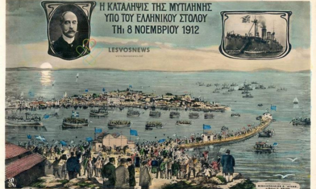 Σαν σήμερα, στις 8 Νοε 1912, κατά τον Α’ Βαλκανικό πόλεμο, Μοίρα του ελληνικού στόλου, υπό τις διαταγές του ναύαρχου Κουντουριώτη καταλαμβάνει τη Μυτιλήνη. Η τουρκική φρουρά θα παραδοθεί μετά από μάχη στην Κλαπάδου. Το νησί έκτοτε θα παραμείνει ελληνικό.