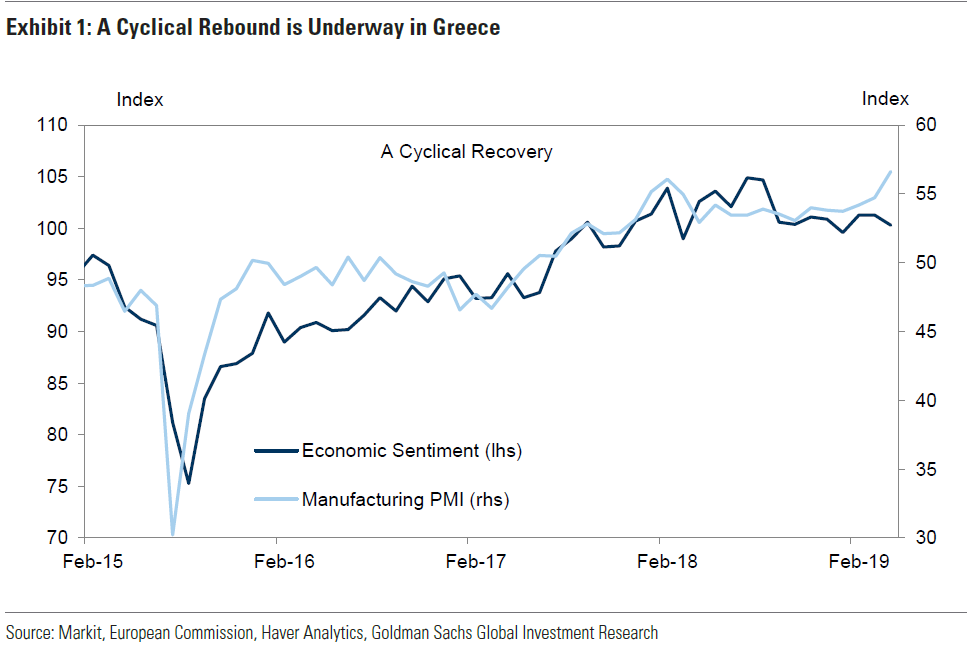 Οι δείκτες PMI της Ελλάδας είναι άνω των 50 μονάδων από τα μέσα του 2017, ενώ έχουν κατά μέσο όρο 56,6 μονάδες τους τελευταίους τρεις μήνες. Αν είναι ασταθής, η πραγματική αύξηση του ΑΕΠ της Ελλάδας ήταν ανθεκτική στην επιβράδυνση της παγκόσμιας ανάπτυξης, ενώ φέτος, η αύξηση της εγχώριας ζήτησης θα υποστηριχθεί και από μια επεκτατική δημοσιονομική πολιτική.