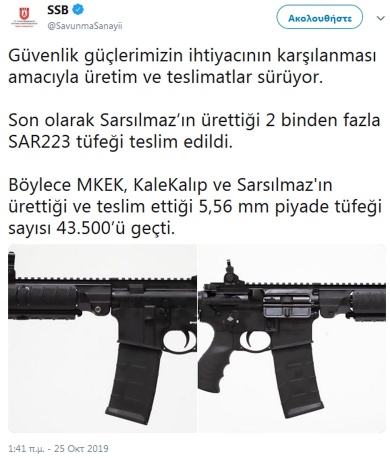 Σε μια εποχή που η εγχώρια αμυντική βιομηχανία στην Ελλάδα περνάει δύσκολα, στην Τουρκία η Διεύθυνση Αμυντικής Βιομηχανίας «θριαμβολογεί» σε σχετική ανάρτηση στο twitter για τα πάνω από 2.000 τυφέκια SAR223 που παραδόθηκαν από την εταιρεία που τα κατασκευάζει στις ένοπλες δυνάμεις και τις Αρχές Ασφαλείας της Τουρκίας