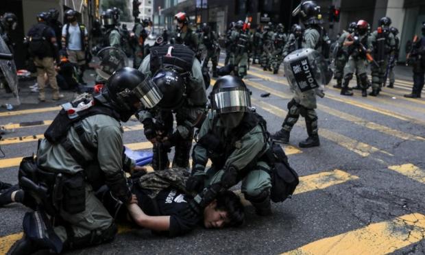 Αστυνομικές δυνάμεις προσπάθησαν να διαλύσουν το πλήθος, ακινητοποιώντας κάποιους ανθρώπους στο έδαφος και χτυπώντας άλλους με γκλομπ κοντά στο Χρηματιστήριο του Χονγκ Κονγκ.