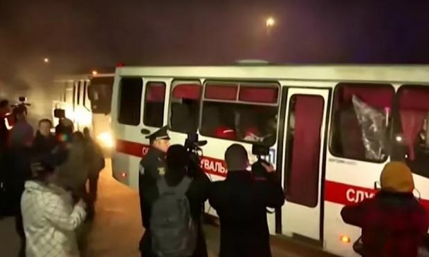 Οι διαδηλωτές έσπασαν τουλάχιστον τρία παράθυρα λεωφορείου, ενώ ορισμένοι από τους επαναπατρισμένους κυμάτιζαν ουκρανικές σημαίες και άλλοι έκρυβαν τα πρόσωπα τους πίσω από κουρτίνες.